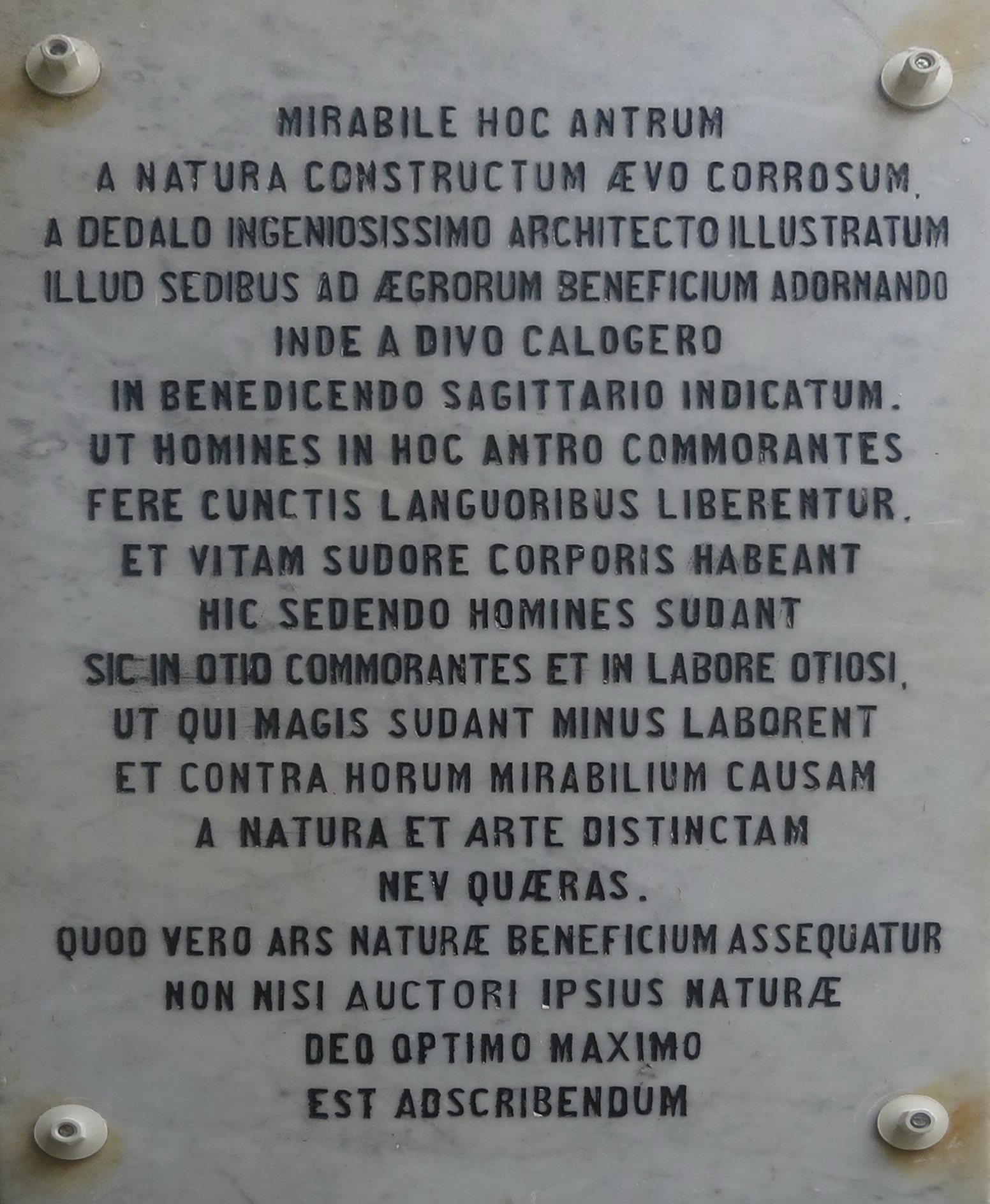 Fazello fa riferimento anche agli ambienti termali oggi ancora esistenti, e denominati stufe: «Dentro a questo antro son certi sedili di pietra fatti per arte, e son posti intorno intorno, dove solevano sedere gli ammalati, e sono intagliate in ciascuno alcune lettere, le quali mostrano che sorte di mali si guariva stando in su quel sedile […]»