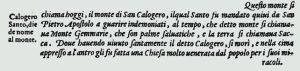 Lo storico domenicano saccense Tommaso Fazello, nella sua opera Le due deche dell’historia di Sicilia pubblicata nel 1573, così descrive il suddetto monte : «Questo monte si chiama hoggi, il monte di San Calogero, il qual Santo fu mandato quivi da San Pietro Apostolo a guarire indemoniati, al tempo, che detto monte si chiamava Monte Gemmarie, che son palme selvatiche, e la terra si chiamava Sacca [oggi Sciacca n.d.A.]. Dove havendo vissuto santamente il detto Calogero, si morì, e nella cima appresso a l’antro gli fu fatta una Chiesa molto venerata dal popolo per i suoi miracoli».